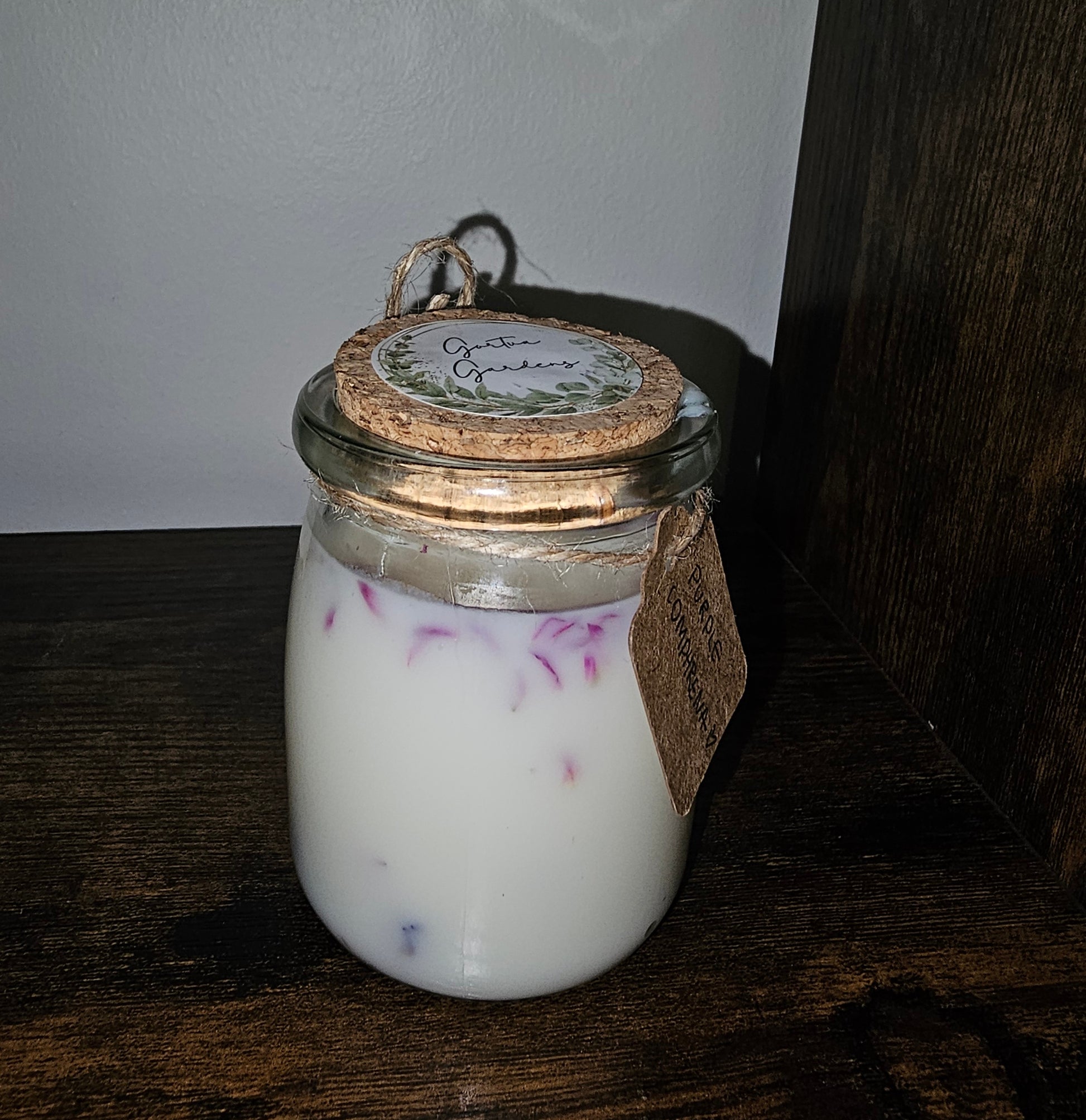 Handmade soy wax candle with all natural purple comphrena flower petals and fragrance